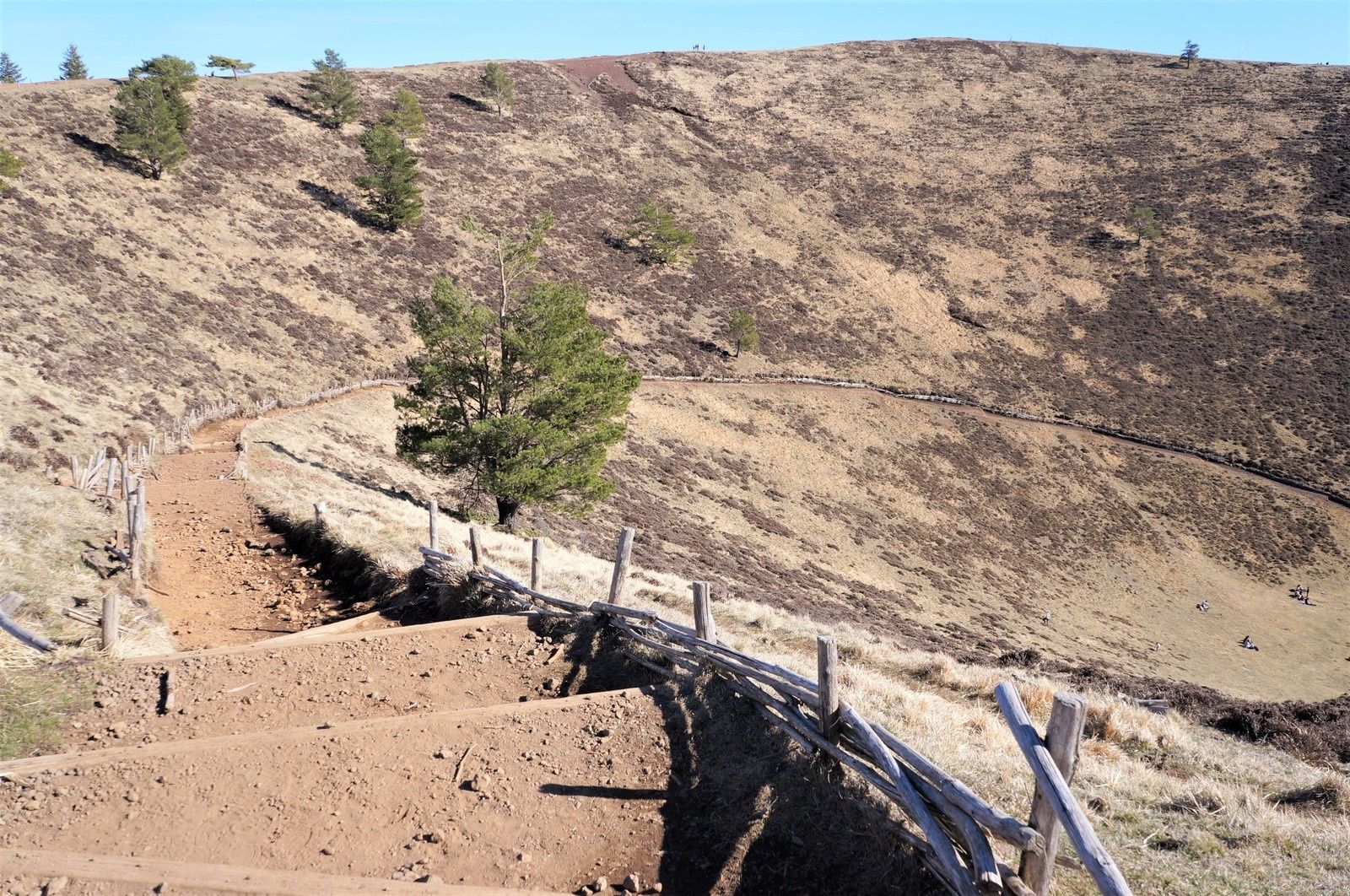 C'est parti pour descendre les 529 marches qui nous ramènent au pied du Pariou. Le Puy-de-Dôme face à nous. Arrivés en bas nous avons le Pariou derrière nous avec son escalier.