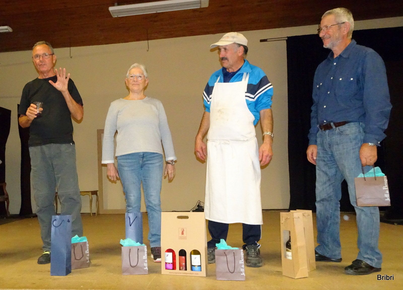 Il appelle le cuisinier José, spécialiste de la paëlla, avec son tablier et Denis, pour les remercier d'avoir préparer cette journée, ils reçoivent bouteilles et chocolats. Puis Jacline nous offre, à nous GOs, bouteilles et chocolats de la part de toute la section marche. Nous les remercions mais leur sympathie nous suffit, nous le faisons avec plaisir.