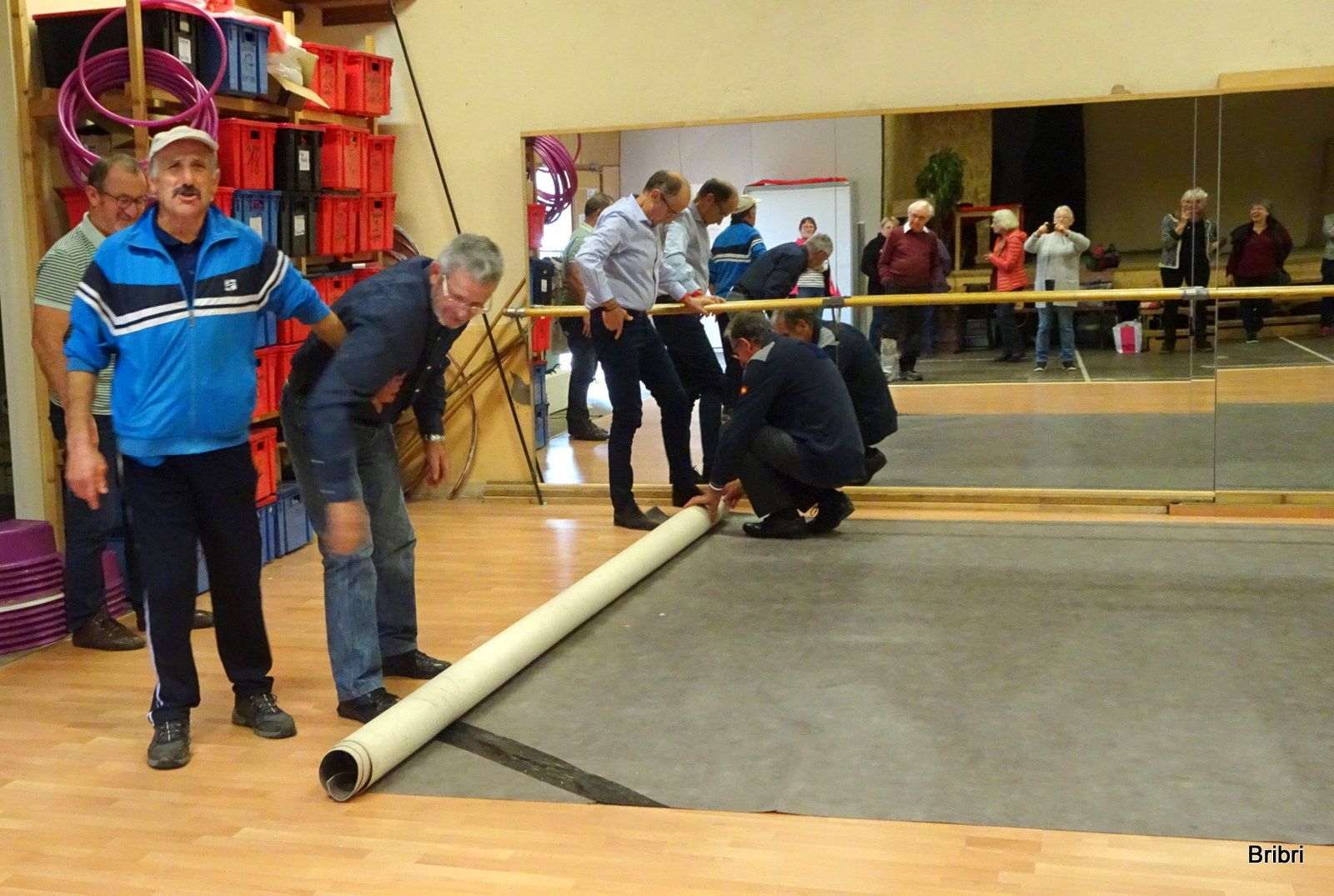 Pour clôturer cet après-midi nous avons eu droit à la mini pièce de théâtre: "le roulage des tapis", sans répétition, ce ne fut pas triste, les dames regardent et s'amusent, pour une fois les hommes travaillent. La première équipe s'est bien débrouillée, il n'en fut pas de même pour la deuxième, heureusement le grand GO et José veillaient, après plusieurs tentatives ils y arrivèrent enfin. Tout était en ordre nous pouvions partir.