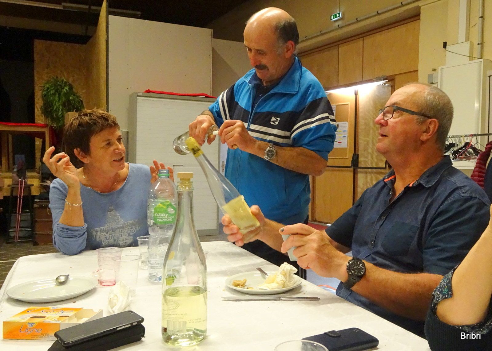 Après le fromage: un excellent St Nectaire; le dessert: tartes aux poires et pommes, plus un bon gâteau fait maison par un marcheur. Puis arrive le canard avec les bouteilles qui circulent, ensuite notre GO fait sa campagne, il annonce se présenter aux prochaines élections, vrai ou pas ? l'avenir nous le dira.