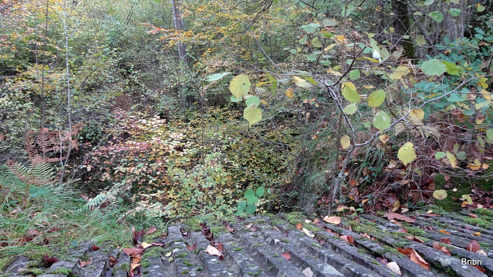 Une pancarte en haut nous avertit que les marches sont hautes, elles sont aussi: manquantes, cassées, dangereuses, il serait temps de les reparer en urgence, avant un accident. De plus cela nous oblige à passer sur le coté, dans la végétation.